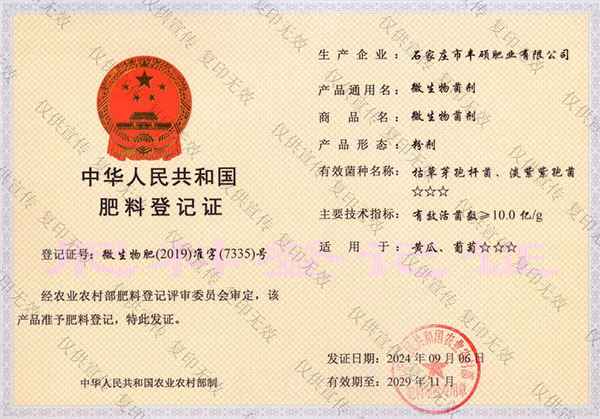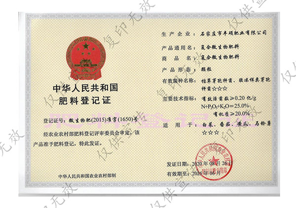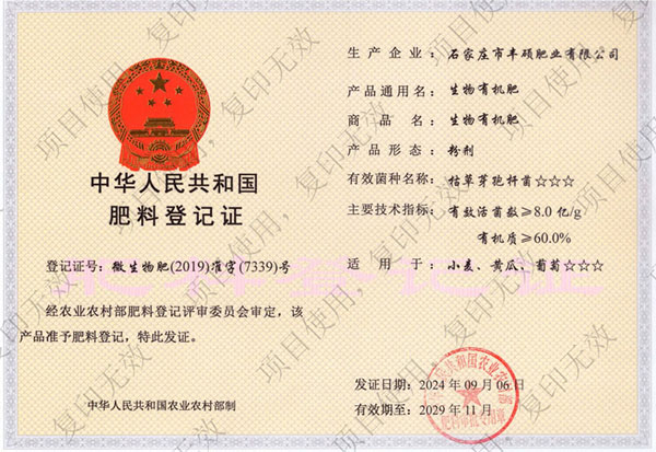 石家莊市豐碩肥業(yè)有限公司是一家集新型肥料的研發(fā)、制造、營銷、服務于一體的高新技術企業(yè),公司自2008年創(chuàng)辦以來,一直致力于新型肥料的技術研發(fā)和市場推廣。公司組建了豐碩新型肥料研究中心(院士專家企業(yè)工作站),自主知識產權研發(fā)團隊專業(yè)科研人員20余人,獲得了多項肥料國家發(fā)明專利。公司目前已擁有發(fā)酵類有機肥、微生物菌劑、生物有機肥、土壤調理劑、大量元素水溶肥、含腐植酸肥料、含氨基酸肥料、中微量元素肥料等8大品類,“金維克”、“豐碩沃農”等2大自有品牌,擁有20多個暢銷品種。目前,我公司已經通過了“ISO9001 質量管理體系認證”、“ISO14001 環(huán)境管理體系認證”、“OHSAS18001 職業(yè)健康管理體系認證”。...